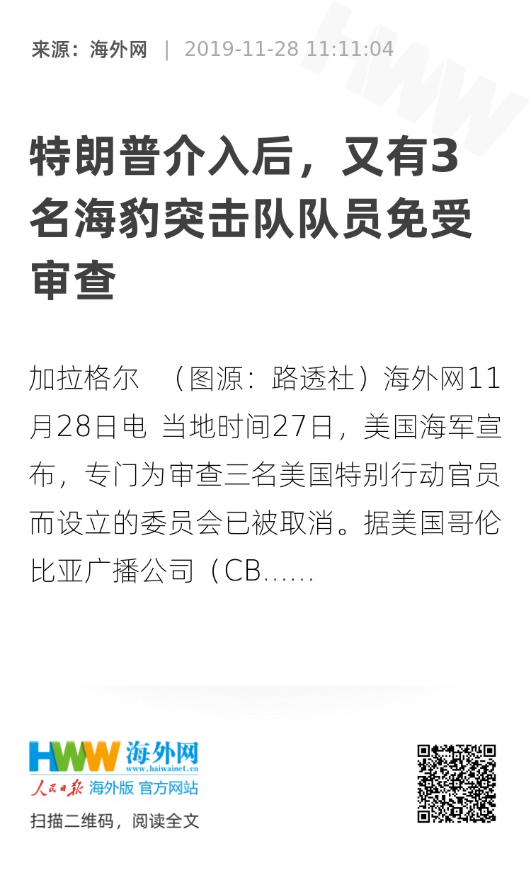 海外网11月28日电 当地时间27日,美国海军宣布,专门为审查三名美国特别行动官员而设立的委员会已被取消。