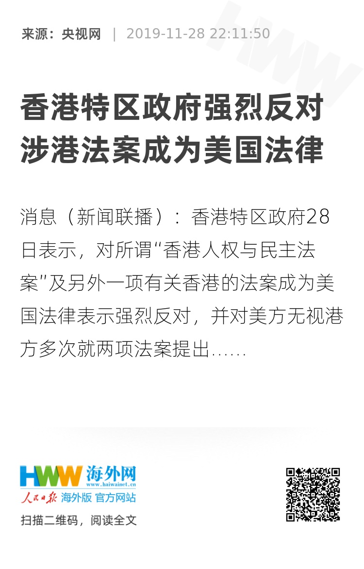 央视网消息(新闻联播):香港特区政府28日表示,对所谓“香港人权与民主法案”及另外一项有关香港的法案成为美国法律表示强烈反对,并对美方无视港方多次就两项法案提出的切实关注表示极度遗憾。两项法案明显干预香港内部事务,既无必要,也毫无理据,更会损害香港和美国之间的关系和利益。