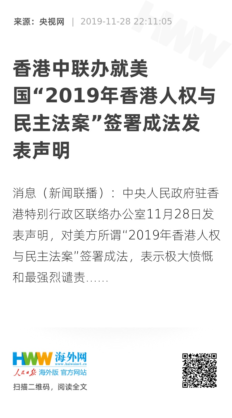 央视网消息(新闻联播):中央人民政府驻香港特别行政区联络办公室11月28日发表声明,对美方所谓“2019年香港人权与民主法案”签署成法,表示极大愤慨和最强烈谴责。