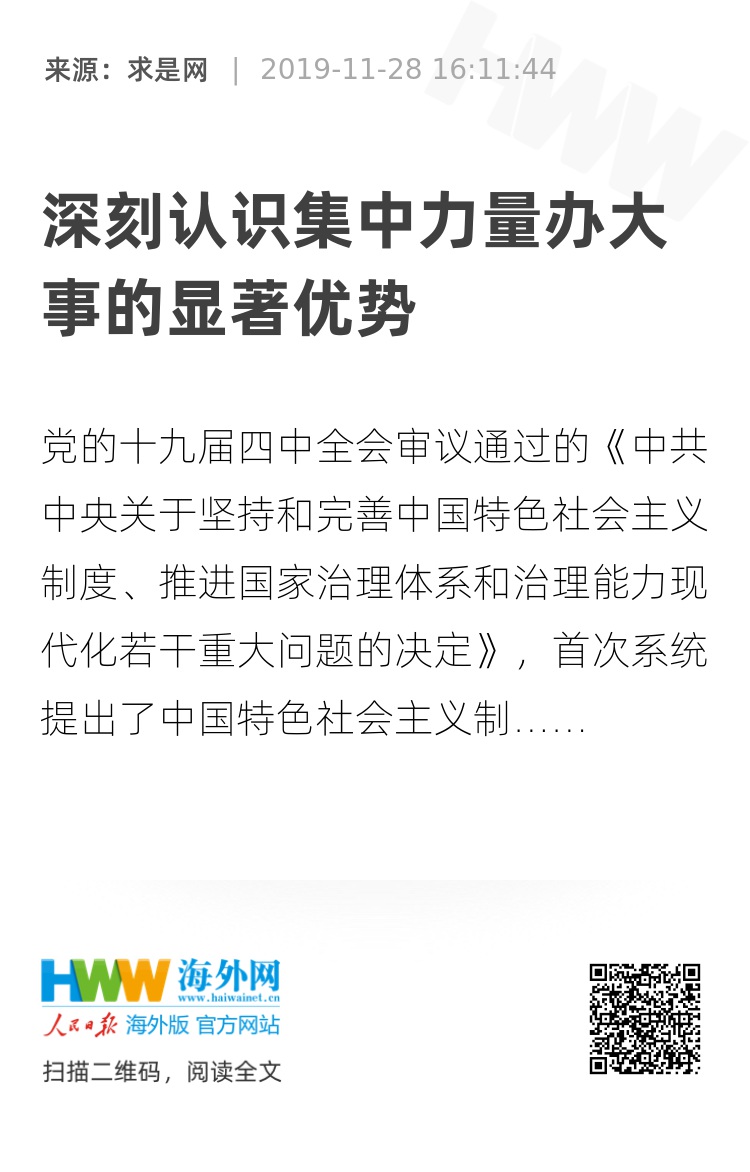 党的十九届四中全会审议通过的《中共中央关于坚持和完善中国特色社会主义制度、推进国家治理体系和治理能力现代化若干重大问题的决定》,首次系统提出了中国特色社会主义制度和国家治理体系具有十三个方面的显著优势,其中有“坚持全国一盘棋,调动各方面积极性,集中力量办大事的显著优势”。集中力量办大事是中国特色社会主义制度的重要特征,也能最直接最形象体现中国特色社会主义制度的显著优势。当前,为贯彻落实四中全会精神要求,增强中国特色社会主义制度自信,进一步发挥好集中力量办大事的显著优势,我们必须深刻认识坚持这一显著优势的重要性和必要性。