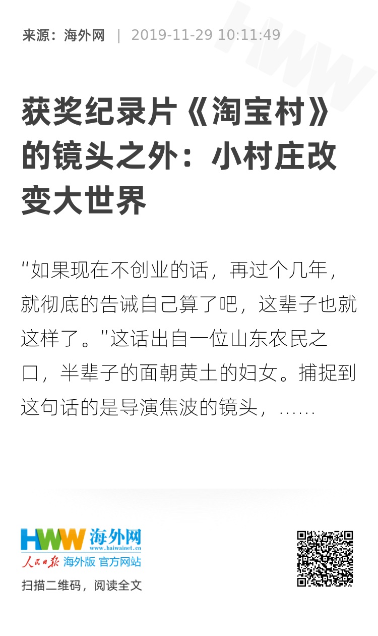 也正因于此,2019年11月27日,《淘宝村》荣获第25届中国纪录片学术奖系列片好作品——行业内最具学术含量和影响力的机构奖项。