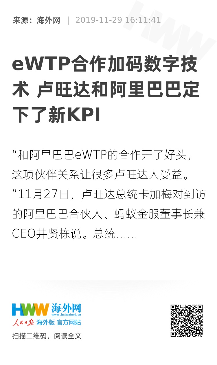 2018年10月31日,卢旺达政府和阿里巴巴签约共建eWTP。这个被称为“非洲新加坡”的国家,也因此搭上了数字经济快车。