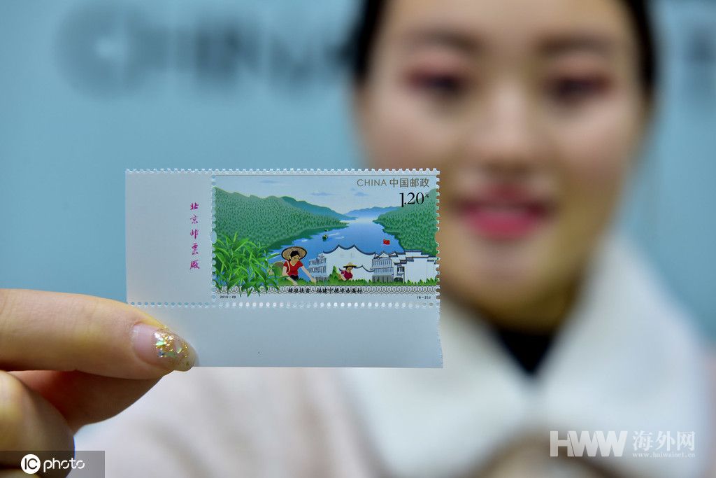 中国邮政集团河北省新乐市分公司工作人员展示发行的《精准扶贫》纪念邮票。