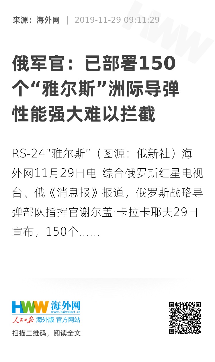 海外网11月29日电 综合俄罗斯红星电视台、俄《消息报》报道,俄罗斯战略导弹部队指挥官谢尔盖·卡拉卡耶夫29日宣布,150个新型洲际导弹系统RS-24“雅尔斯”的发射装置已经收到,并开始服役。该导弹在整个飞行阶段难以被敌方拦截。