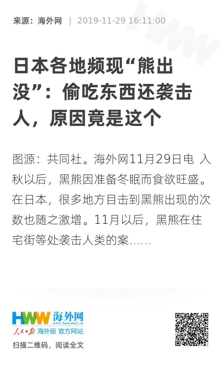 据日本环境省的统计显示,剔除亚洲黑熊并未栖息的地区等之外,日本全国37个都府县2019年4月至9月收到的出没信息为1.2226万件。超过2017和2018年度已成定局。新潟县的负责人认为,“今年成为主要食物的山毛榉的果实歉收,降至最低水平,因此熊来到村落寻找民房的柿子和厨余垃圾”。