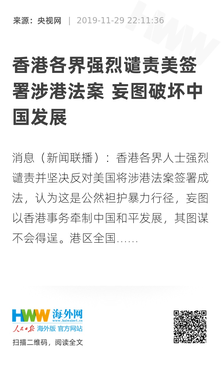 央视网消息(新闻联播):香港各界人士强烈谴责并坚决反对美国将涉港法案签署成法,认为这是公然袒护暴力行径,妄图以香港事务牵制中国和平发展,其图谋不会得逞。