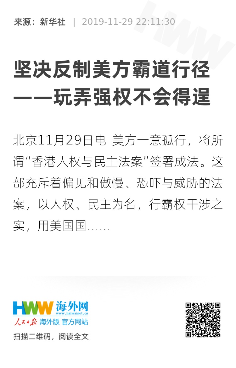 新华社北京11月29日电 美方一意孤行,将所谓“香港人权与民主法案”签署成法。这部充斥着偏见和傲慢、恐吓与威胁的法案,以人权、民主为名,行霸权干涉之实,用美国国内法干涉中国内政,这是对包括香港同胞在内的全体中国人民的严重挑衅,在世人面前赤裸裸地暴露了美方的强盗嘴脸和霸权本性。