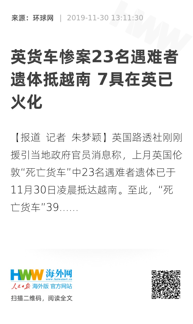 【环球网报道 记者 朱梦颖】英国路透社刚刚援引当地政府官员消息称,上月英国伦敦“死亡货车”中23名遇难者遗体已于11月30日凌晨抵达越南。至此,“死亡货车”39名遇难者遗体已全部被带回越南,结束了这一悲剧事件。