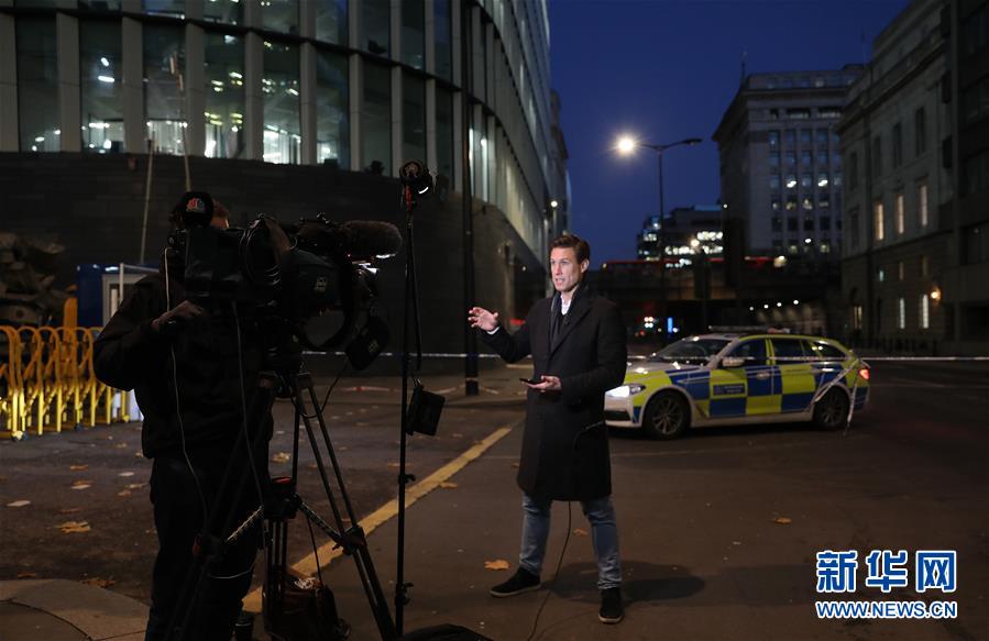 11月29日,在英国伦敦,记者在袭击事件现场附近报道。 伦敦警方29日说,当天发生在伦敦桥上的持刀伤人事件是一起“恐怖袭击”,一名男性嫌疑人被警方开枪打死。 新华社发(伊莎贝尔·因方特 摄)
