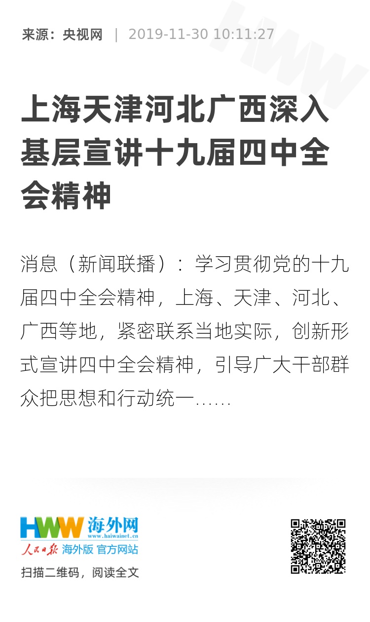 央视网消息(新闻联播):学习贯彻党的十九届四中全会精神,上海、天津、河北、广西等地,紧密联系当地实际,创新形式宣讲四中全会精神,引导广大干部群众把思想和行动统一到全会精神上来。