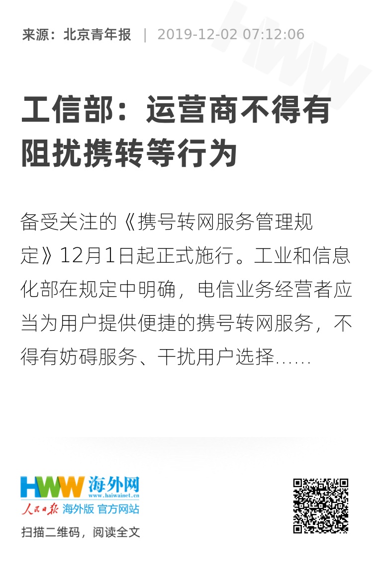 备受关注的《携号转网服务管理规定》12月1日起正式施行。工业和信息化部在规定中明确,电信业务经营者应当为用户提供便捷的携号转网服务,不得有妨碍服务、干扰用户选择、阻挠携转、降低通信服务质量、比较宣传、虚假宣传等违规行为。中国信通院技术与标准研究所所长敖立介绍,携转完成后,原运营商按照本网用户注销时的规则处理携出用户账户余额。且携入用户享有与本网新入网用户同等条件下同等权利,和正常入网用户一样可选择企业在售的套餐。