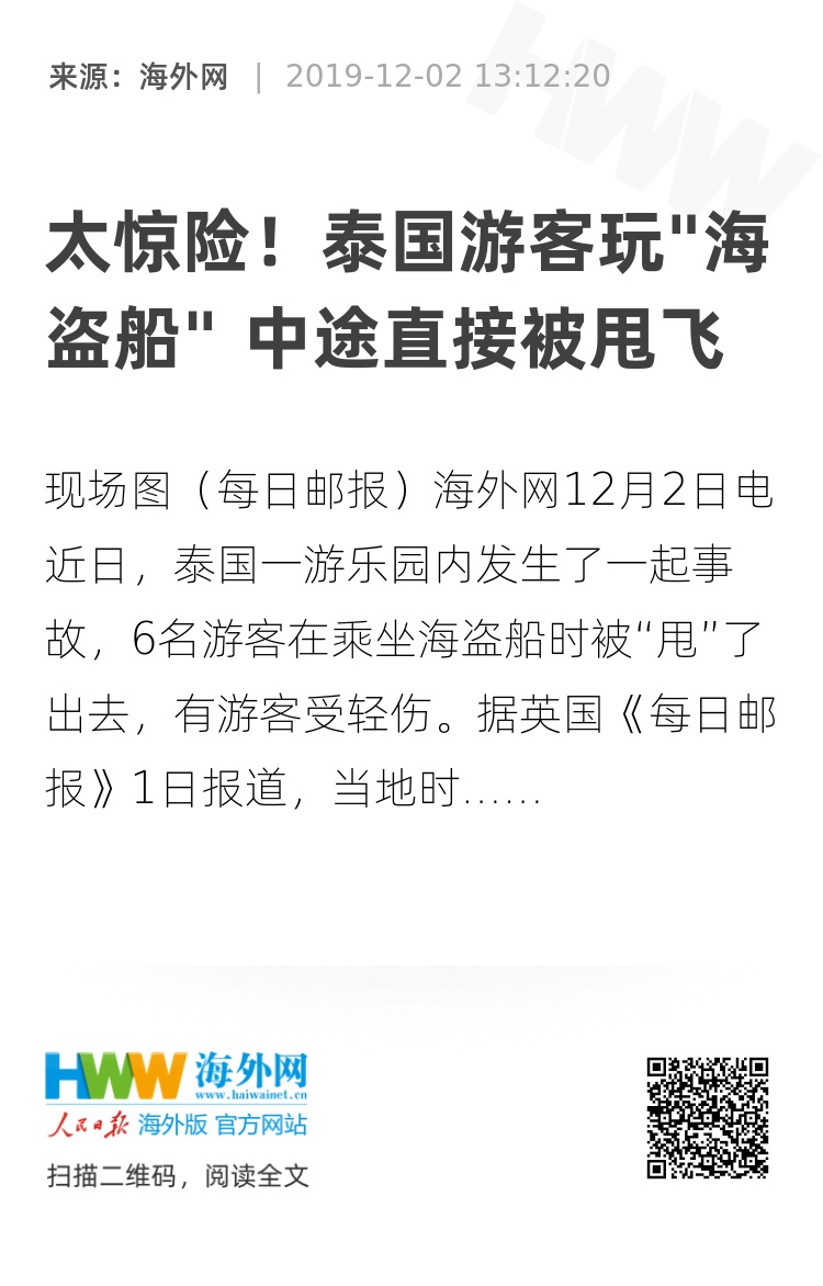 海外网12月2日电 近日,泰国一游乐园内发生了一起事故,6名游客在乘坐海盗船时被“甩”了出去,有游客受轻伤。