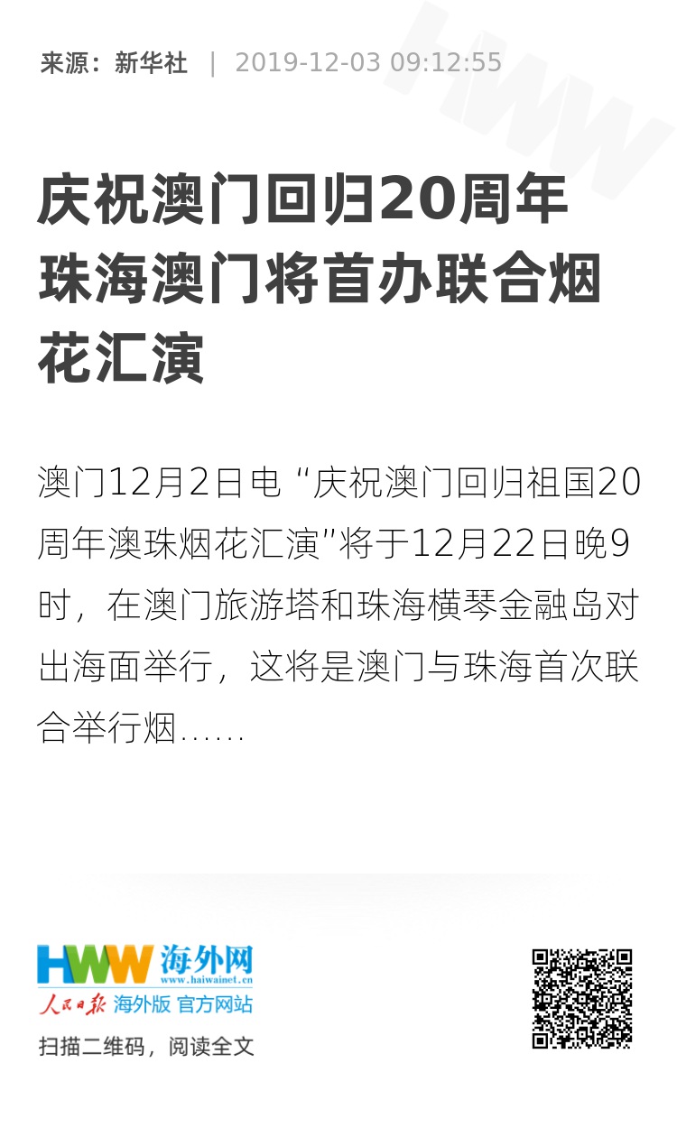 新华社澳门12月2日电 “庆祝澳门回归祖国20周年澳珠烟花汇演”将于12月22日晚9时,在澳门旅游塔和珠海横琴金融岛对出海面举行,这将是澳门与珠海首次联合举行烟花汇演。
