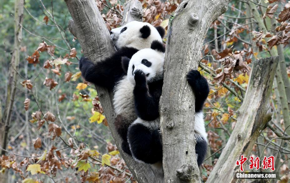 12月2日,中国大熊猫保护研究中心都江堰基地里的大熊猫宝宝们在熊猫乐园卖萌,憨态可掬,迷倒众粉丝。