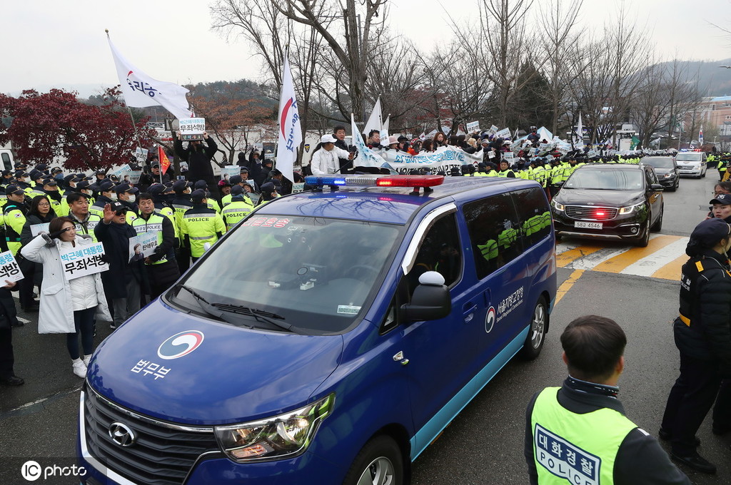 当地时间2019年12月3日,韩国首尔,接受肩部手术的韩国前总统朴槿惠结束康复治疗,从首尔圣母医院出院返回看守所。图源:东方IC