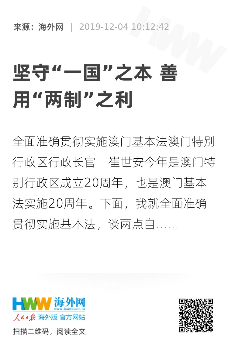 作为“一国两制”事业的见证者,同时也是践行者,这20年的经历使我深深地认识到,“一国两制”和基本法,既能保证澳门特别行政区有“一国之本”,有强大的国家做后盾和支撑;又能保证澳门特别行政区有“两制之利”,保持高度自治和地域优势,从而实现长期繁荣稳定。这样的制度安排不仅是尊重历史、正视现实的客观需要,而且能够十分有效地保证和推动澳门社会进步与发展。