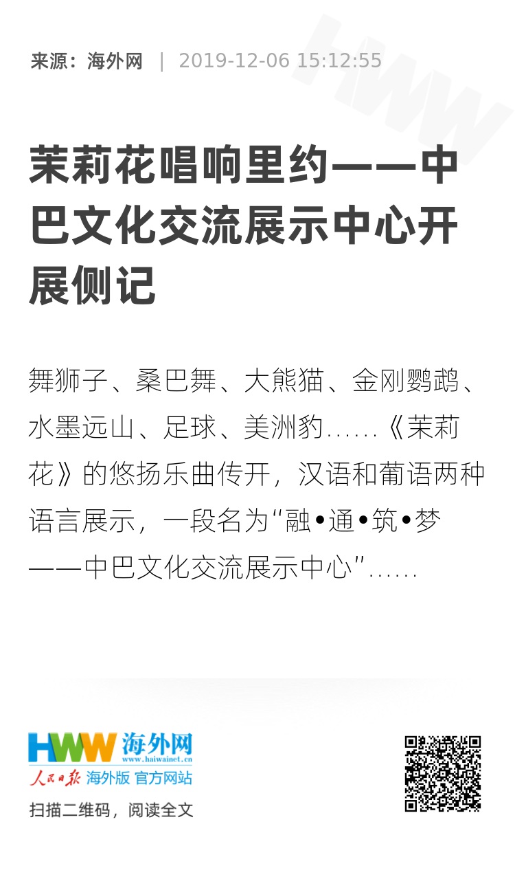 舞狮子、桑巴舞、大熊猫、金刚鹦鹉、水墨远山、足球、美洲豹……《茉莉花》的悠扬乐曲传开,汉语和葡语两种语言展示,一段名为“融•通•筑•梦——中巴文化交流展示中心”的展览在手机屏幕上展开。11月22日,国家电网巴西控股有限公司员工拉娜正在手机上观赏一场多媒体的文化盛宴。与此同时,在位于巴西里约热内卢市政厅的中巴文化交流展示中心,观展游客络绎不绝。这个季节的里约阴雨绵绵,却抵挡不住观众们的热情。