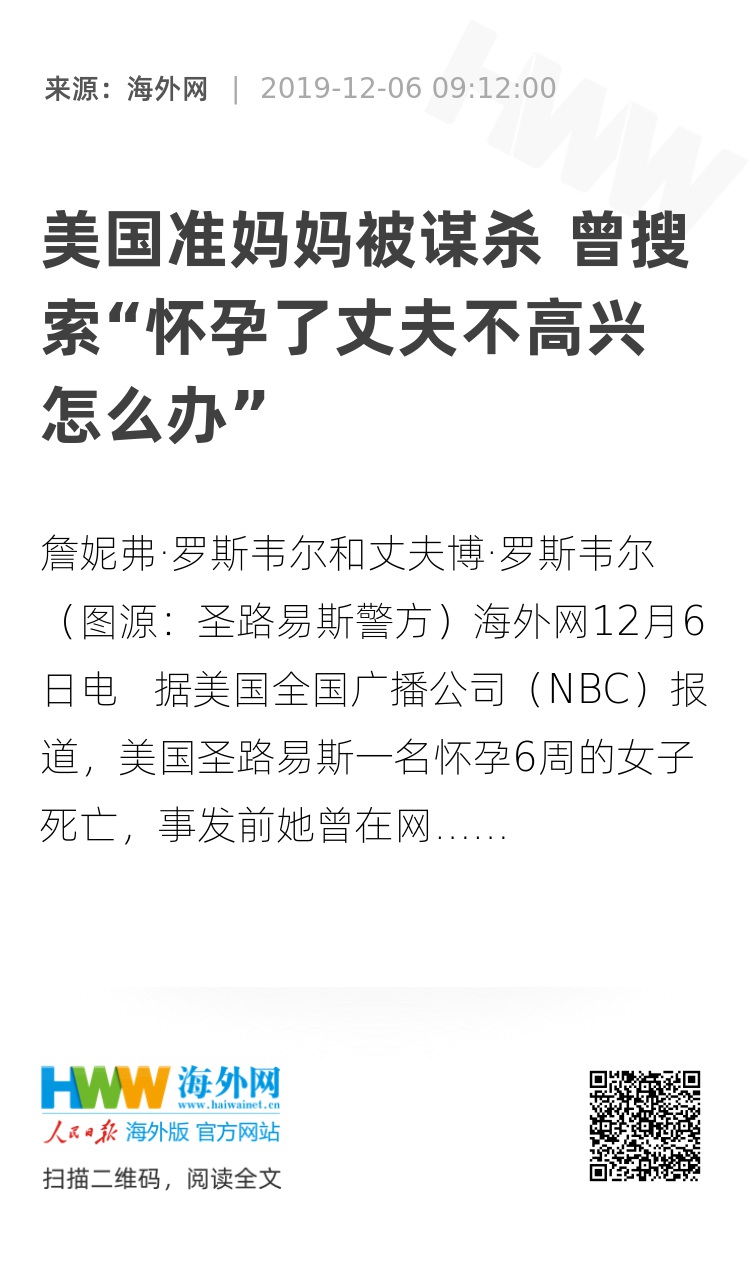 海外网12月6日电 据美国全国广播公司(NBC)报道,美国圣路易斯一名怀孕6周的女子死亡,事发前她曾在网上搜索“如果怀孕了丈夫不高兴该怎么办”。目前,其丈夫已被警方逮捕。