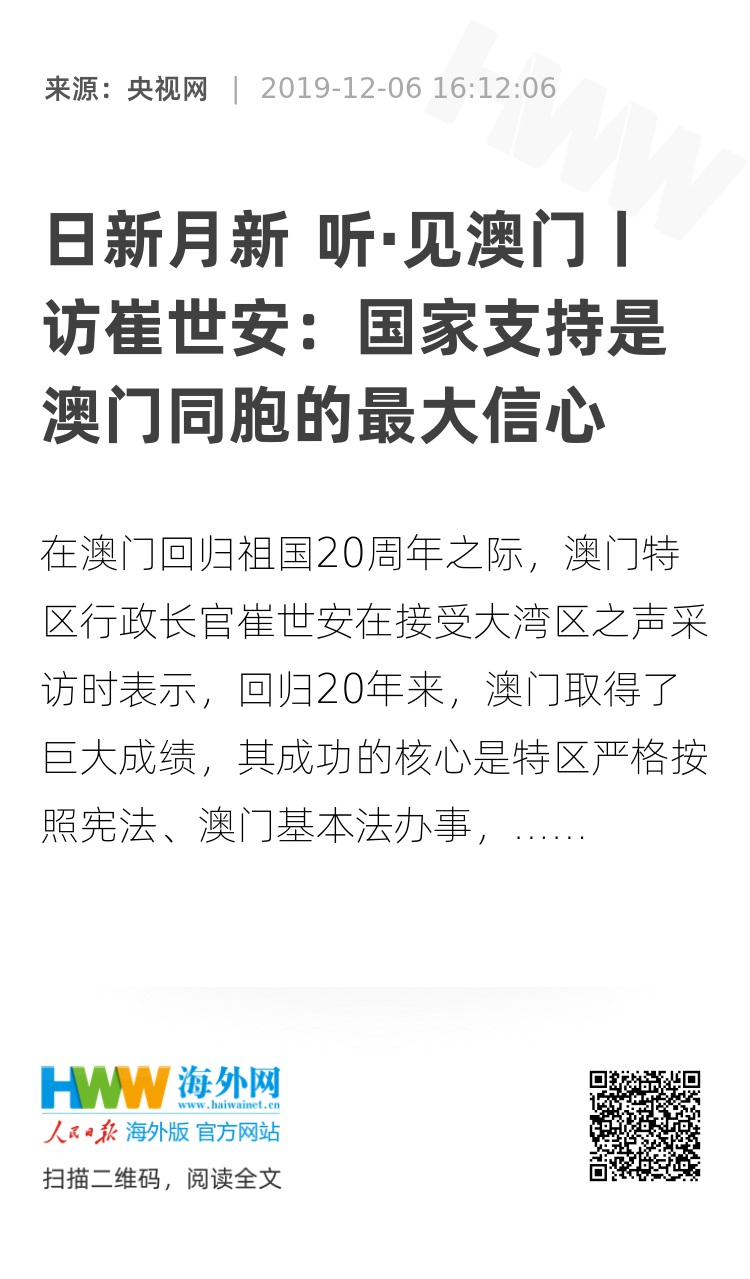 在澳门回归祖国20周年之际,澳门特区行政长官崔世安在接受大湾区之声采访时表示,回归20年来,澳门取得了巨大成绩,其成功的核心是特区严格按照宪法、澳门基本法办事,“一国两制”、“澳人治澳”、高度自治在澳门有效落实。