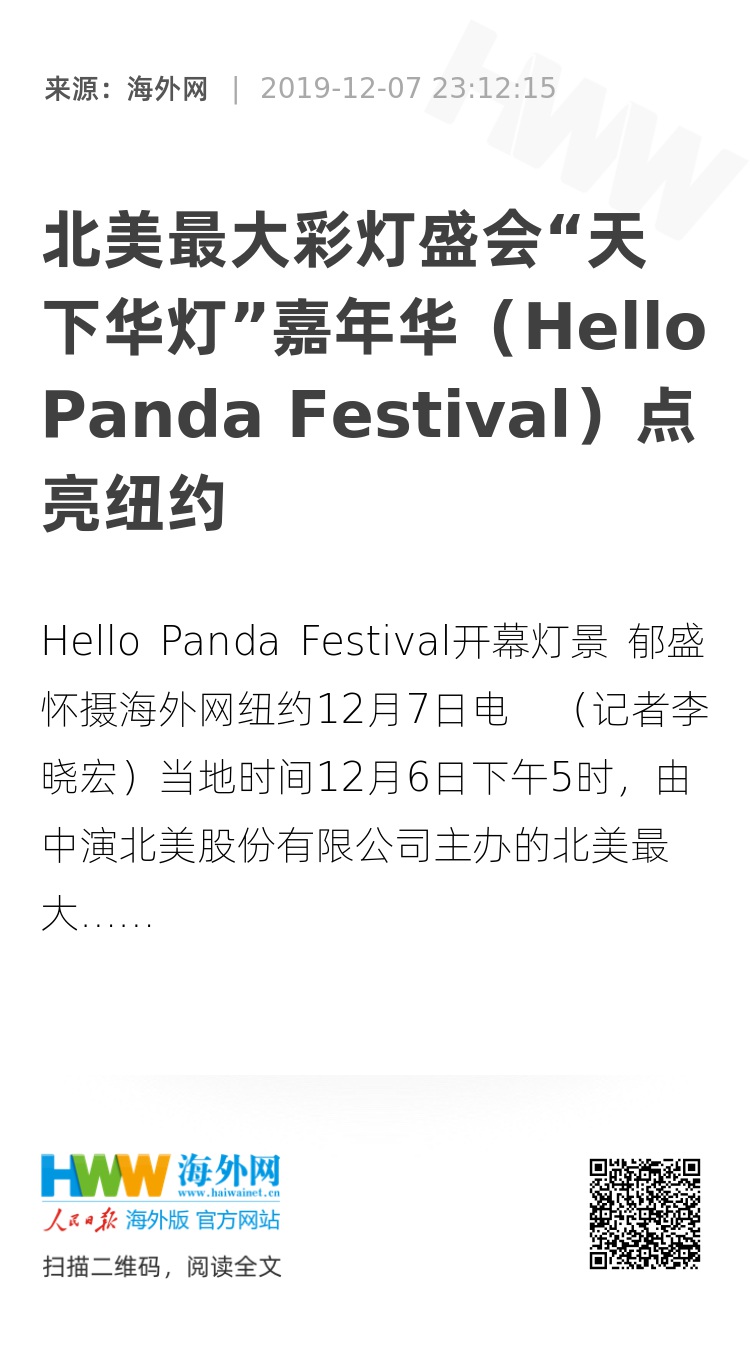 “我们过去做室内演出为主,现在逐渐走上举办综合性活动之路。此次选择美国的假日季举办灯展嘉年华,旨在把它打造成纽约的一个传统节日项目,为纽约客增加一个有吃、有喝、有玩、有乐的辞旧迎新好去处。” 王修芹介绍,“我们计划在未来5年,每年冬季都在纽约花旗球场推出Hello Panda Festival。”
