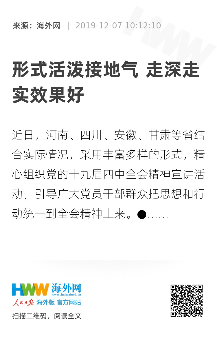 近日,河南、四川、安徽、甘肃等省结合实际情况,采用丰富多样的形式,精心组织党的十九届四中全会精神宣讲活动,引导广大党员干部群众把思想和行动统一到全会精神上来。