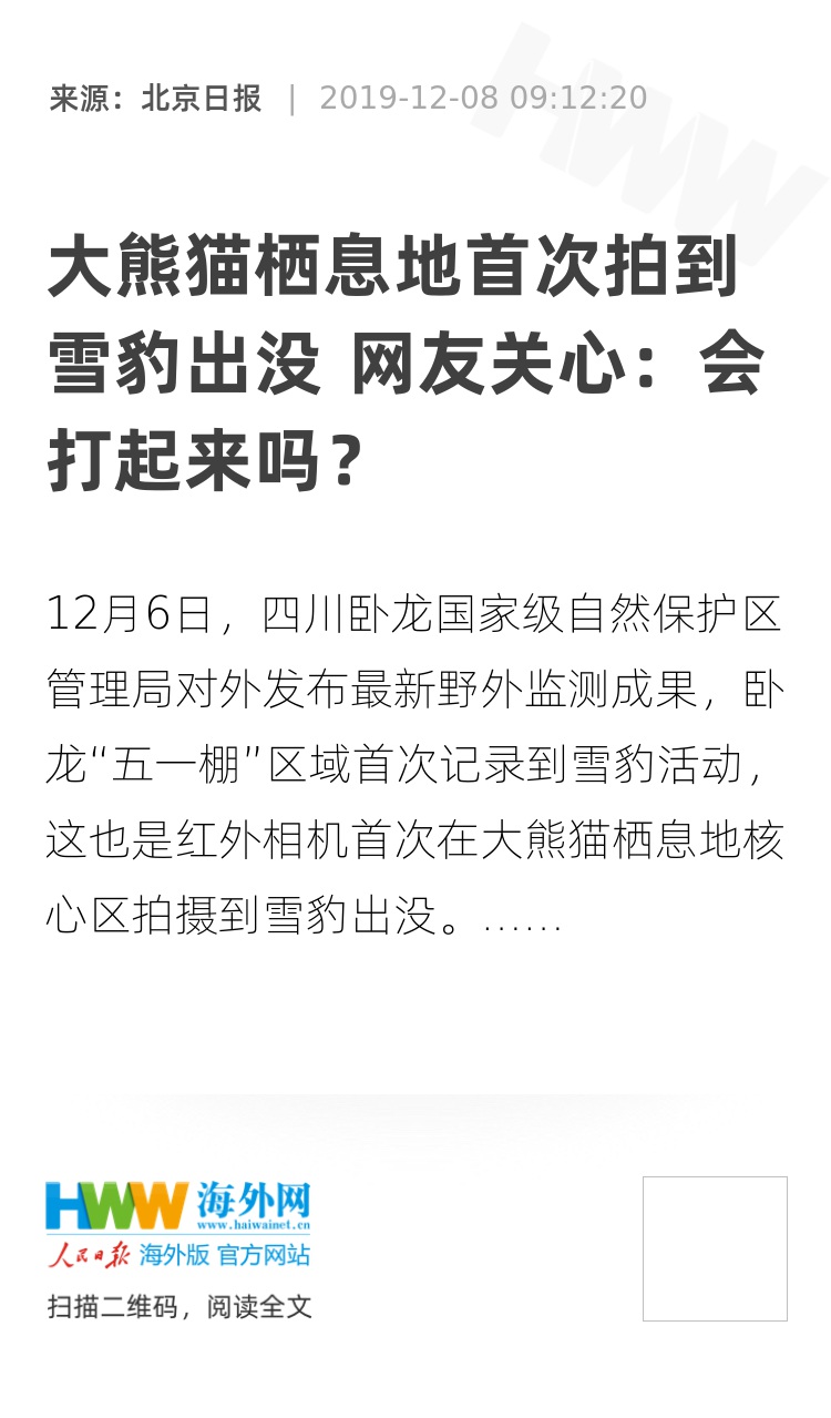 12月6日,四川卧龙国家级自然保护区管理局对外发布最新野外监测成果,卧龙“五一棚”区域首次记录到雪豹活动,这也是红外相机首次在大熊猫栖息地核心区拍摄到雪豹出没。