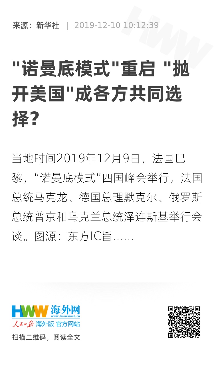 旨在解决乌克兰东部冲突的第六次“诺曼底模式”四国峰会9日在法国举行。时隔3年,“诺曼底模式”再度重启,俄乌德法四国能否为乌克兰乃至欧洲带来和平,引发多方关注。