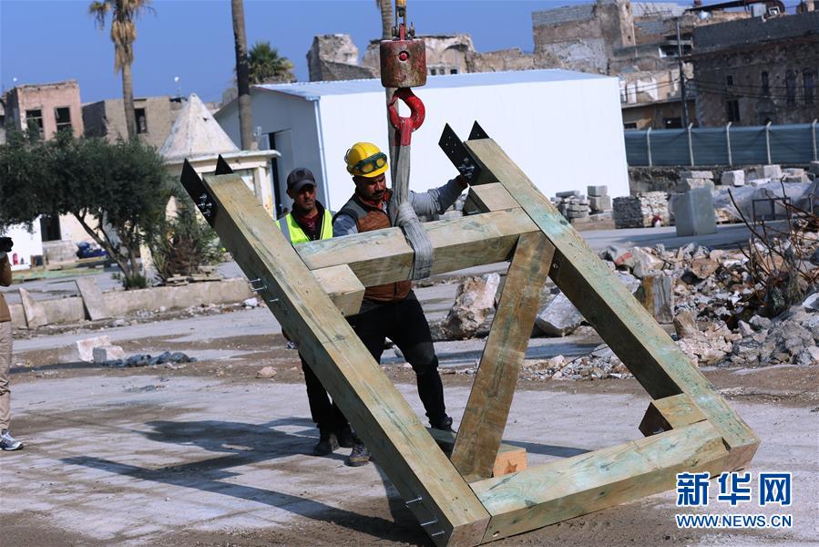 12月4日,在伊拉克摩苏尔老城,工人在努里清真寺开展重建。 新华社发(哈利勒·达伍德摄)