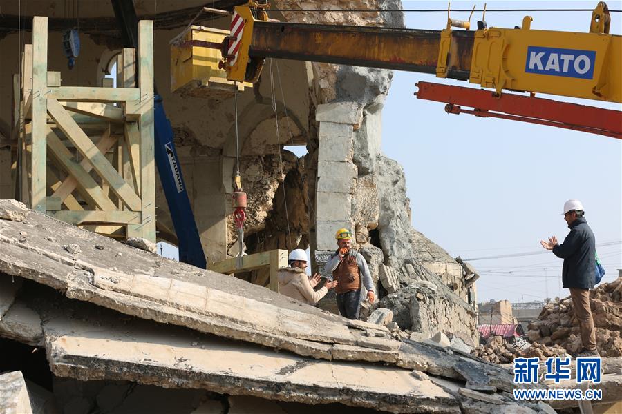 12月4日,在伊拉克摩苏尔老城,工人在努里清真寺开展重建。 新华社发(哈利勒·达伍德摄)