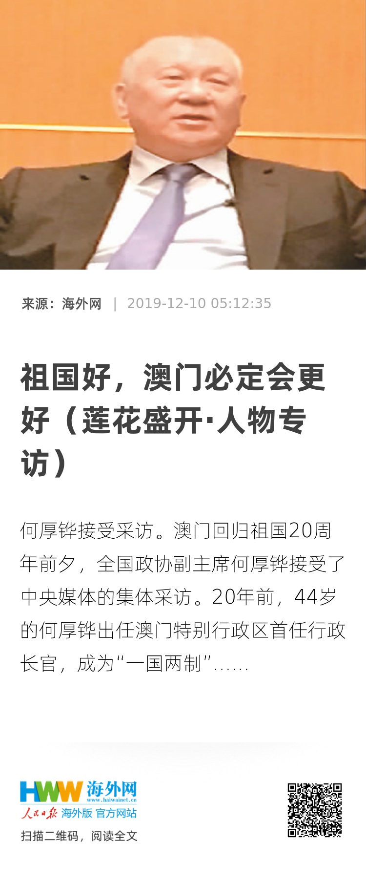 澳门回归祖国20周年前夕,全国政协副主席何厚铧接受了中央媒体的集体采访。20年前,44岁的何厚铧出任澳门特别行政区首任行政长官,成为“一国两制”在澳实践的首位执行者。20年后回首往事,何厚铧毫不犹豫地说,“一国两制”实践拥有强大生命力,其在澳门的实践毫无疑问取得了巨大成功。