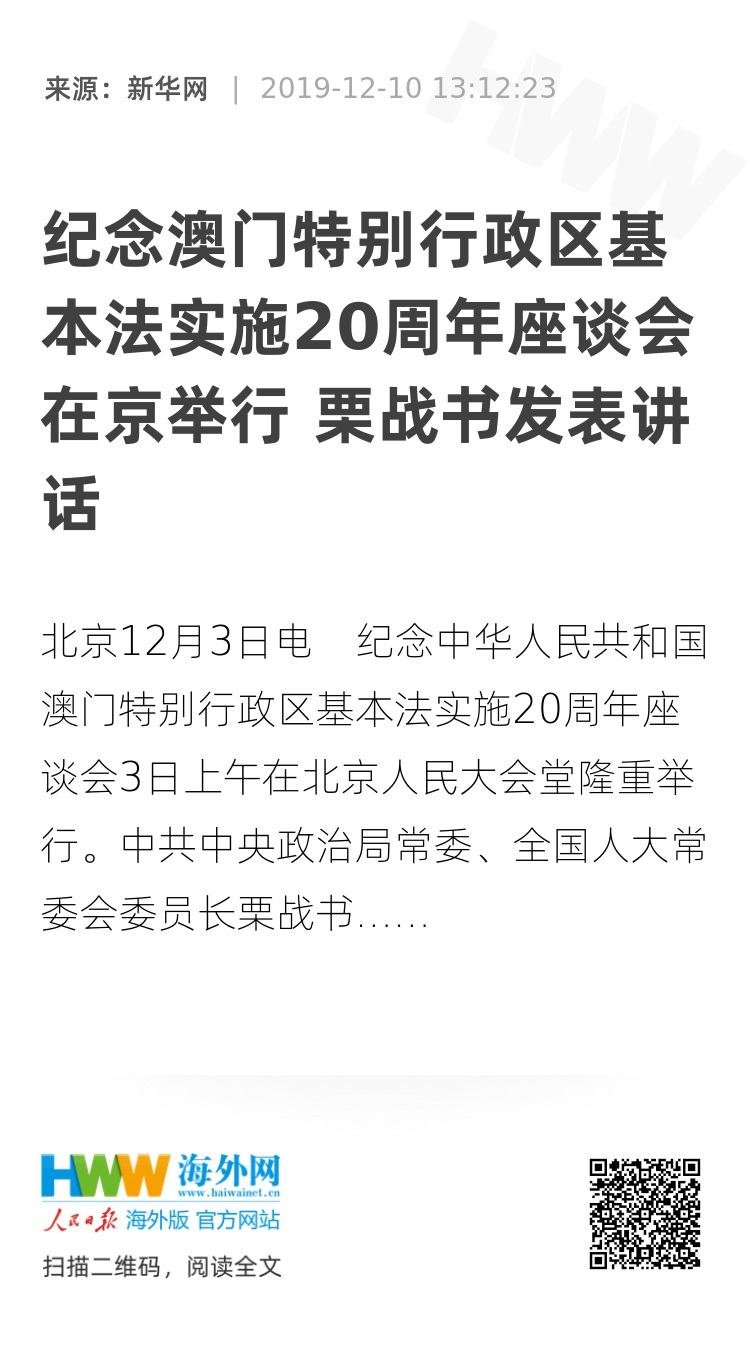 新华社北京12月3日电 纪念中华人民共和国澳门特别行政区基本法实施20周年座谈会3日上午在北京人民大会堂隆重举行。中共中央政治局常委、全国人大常委会委员长栗战书在会上发表讲话强调,要深入学习贯彻习近平总书记关于港澳工作的重要论述精神,坚持和完善“一国两制”制度体系,在宪法和澳门基本法的轨道上推进具有澳门特色的“一国两制”成功实践。中共中央政治局常委、国务院副总理韩正出席座谈会。