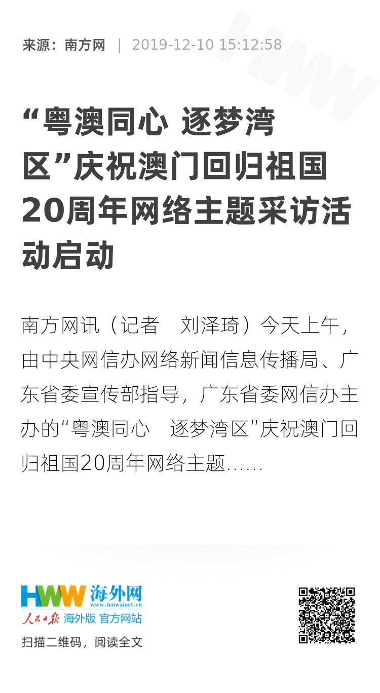 据了解,在接下来的4天时间,人民网、新华网、央视网、中国网,以及南方网、金羊网、南方财经网、触电新闻、澳门日报、澳广视等中央和粤澳两地的主要媒体网站记者将深入珠海、澳门两地,实地走访横琴自贸片区、粤澳跨境工业园、横琴新口岸、粤澳新通道、澳门大学、澳门街坊总会联合会等十余项推进粤港澳大湾区建设的重要项目和平台,以及粤澳合作的代表性成果。