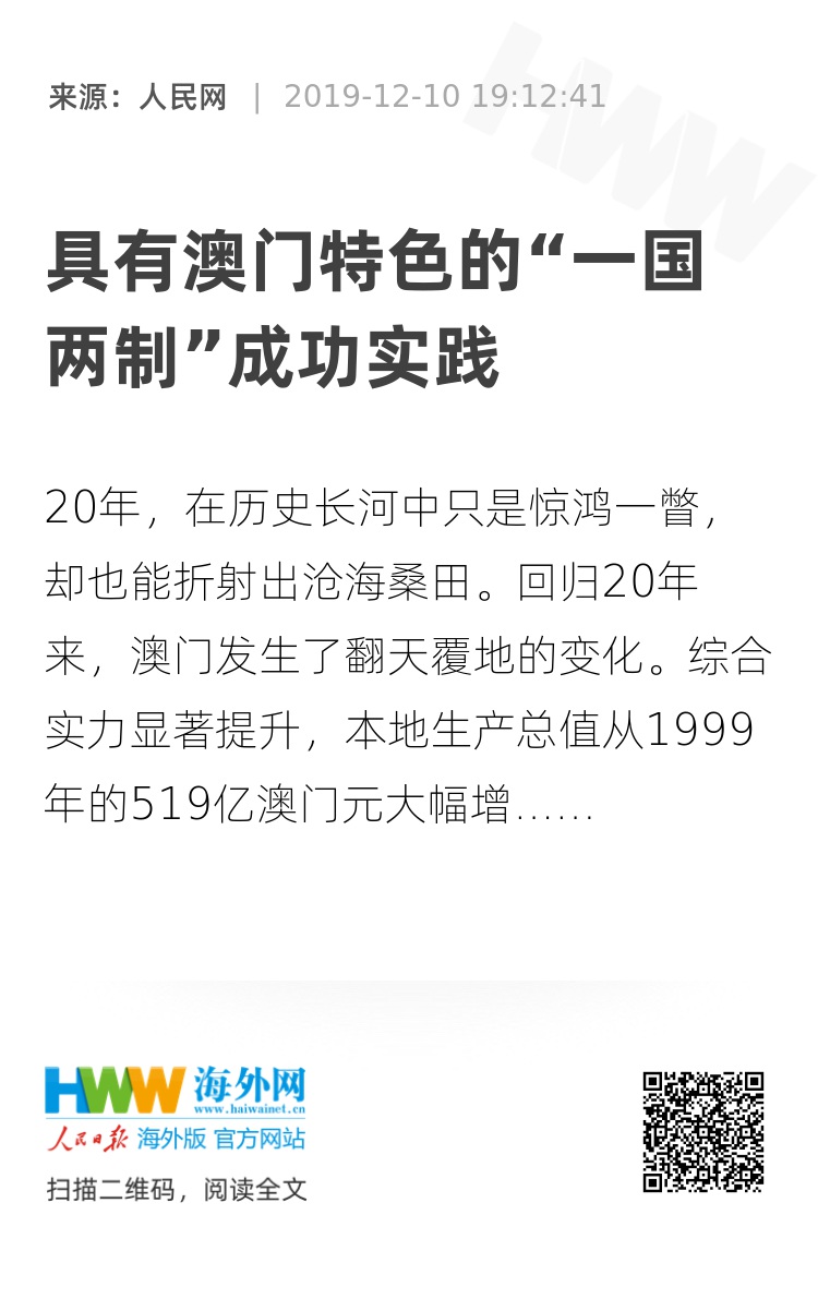 从回归前夕连年治安混乱、经济低迷、民生欠账,到今日政治稳定、经济繁荣、社会和谐,20年的澳门实践充分证明,“‘一国两制’是完全行得通、办得到、得人心的!”