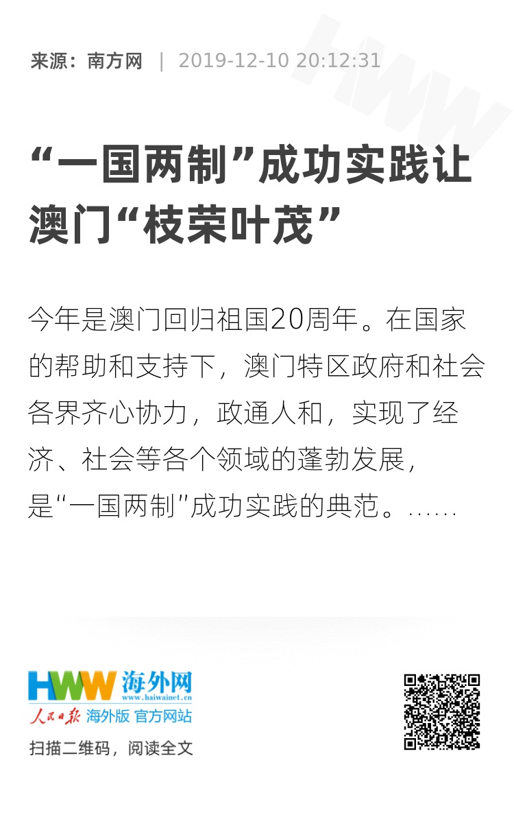二十弱冠意气发,濠江激荡万顷潮。澳门回归以来的20年生动实践,丰富了“一国两制”的内涵。事实证明,“一国两制”完全行得通、办得到、得人心。展望新时代,继续坚守“一国”之本,善用“两制”之利,发挥制度优势,提升治理效能,澳门的发展必将迎接更加光辉璀璨的未来,“一国两制”成功实践必定能够让澳门更加“枝荣叶茂”。(南方网郭雪营)