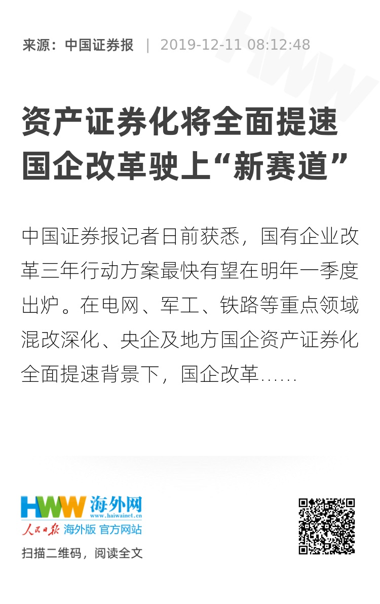 中国证券报记者日前获悉,国有企业改革三年行动方案最快有望在明年一季度出炉。在电网、军工、铁路等重点领域混改深化、央企及地方国企资产证券化全面提速背景下,国企改革将在新的行动方案指引下驶入“新赛道”。