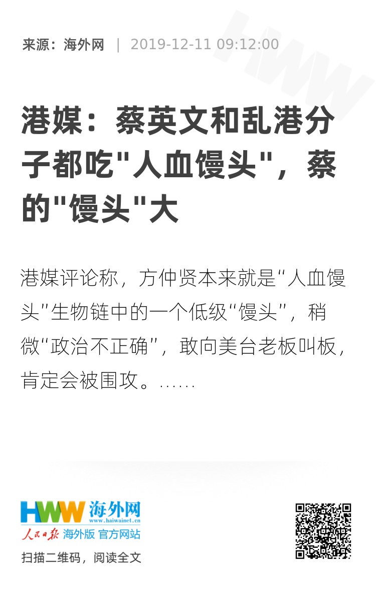 香港《文汇报》11日以《方仲贤和蔡英文一齐吃“人血馒头”》为题发文,文章指出,方仲贤之流煽动暴力,捞取政治本钱,本来就在吃“人血馒头”,却痛斥蔡英文吃“人血馒头”,这只是五十步笑百步。方仲贤吃被其唆摆学生的“人血馒头”,蔡英文又吃香港泛暴派的“人血馒头”,大鱼吃小鱼而已。方仲贤之流赴台乞求做“难民”,本就荒谬至极,结果“难民”做不成,反而两面不是人。