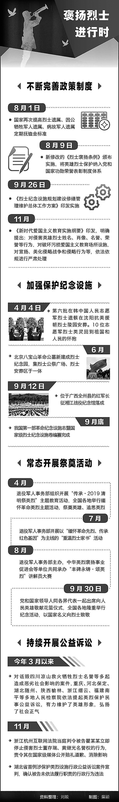 2019年,《烈士褒扬条例》修改实施、《烈士纪念设施规划建设修缮管理维护总体工作方案》印发、国家再次提升优抚对象抚恤和生活补助标准、第六批在韩中国人民志愿军烈士遗骸在沈阳抗美援朝烈士陵园安葬……一系列强有力的国家行动,彰显着捍卫英雄、缅怀先烈的坚定决心,全社会褒扬烈士功绩、弘扬烈士精神的氛围不断浓厚。