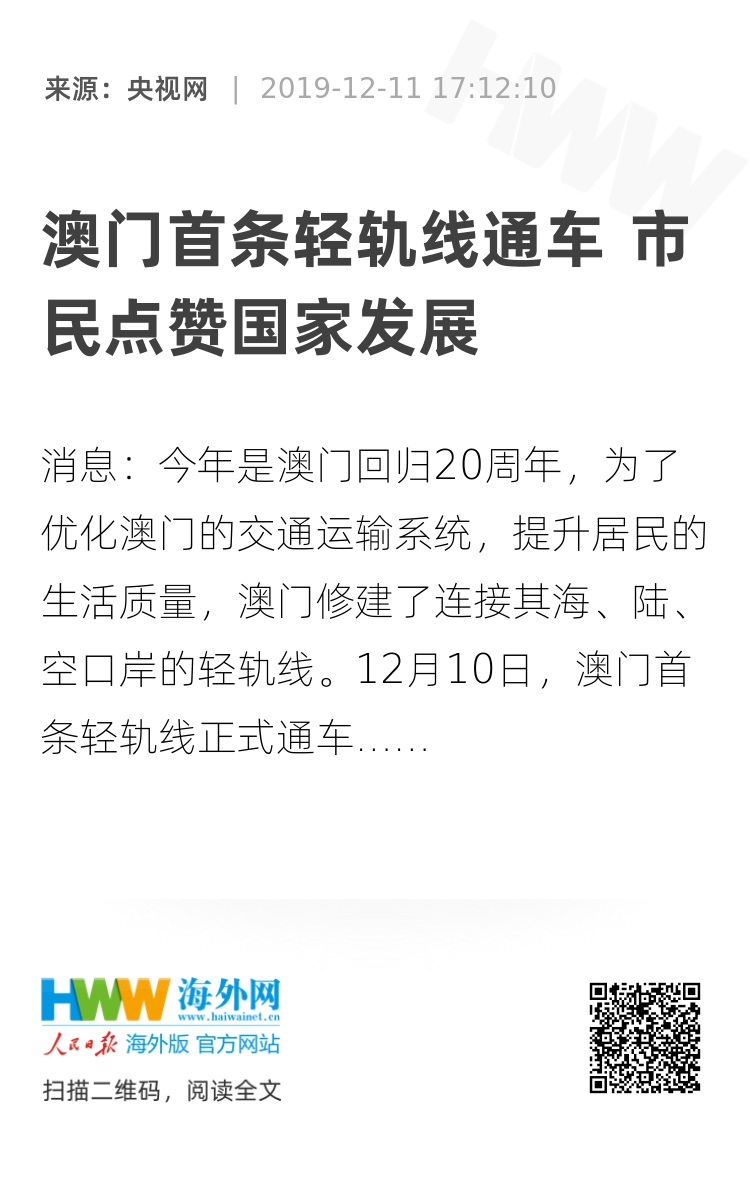 央视网消息:今年是澳门回归20周年,为了优化澳门的交通运输系统,提升居民的生活质量,澳门修建了连接其海、陆、空口岸的轻轨线。12月10日,澳门首条轻轨线正式通车,当天大批澳门市民排队体验轻轨,不少搭乘列车的市民表示,轻轨的开通为他们的出行带来了便利,他们希望澳门的发展能够越来越好。
