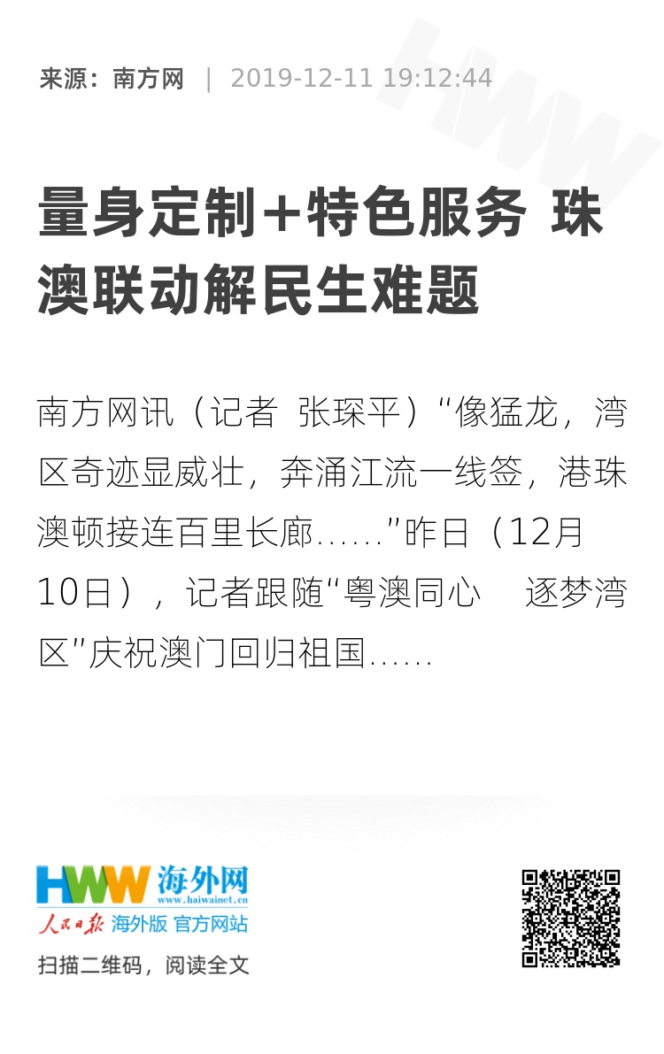 记者从昨天举行的媒体见面会了解到,今年以来,珠海市委、市政府与澳门特区政府携手,共同研究制定一系列创新举措,不断深化两地民生合作,取得了积极成效。截至10月底,在珠海参加社保的澳门居民共2383人,在珠海就业的澳门居民607人。珠海市委台港澳办主任邹桦介绍,珠海市主要通过保障子女教育、保障医疗服务、保障交通居住以及加强青年创业就业和实习交流的“三保障一加强”措施来创造更多有利条件,便利澳门居民在珠海工作生活发展,帮助他们融入国家发展大局。