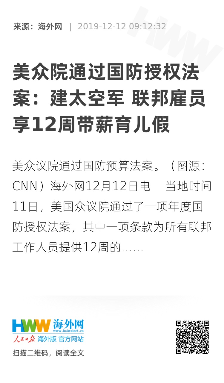 海外网12月12日电 当地时间11日,美国众议院通过了一项年度国防授权法案,其中一项条款为所有联邦工作人员提供12周的带薪育儿假,此外,法案还为组建太空军提供资金支持。