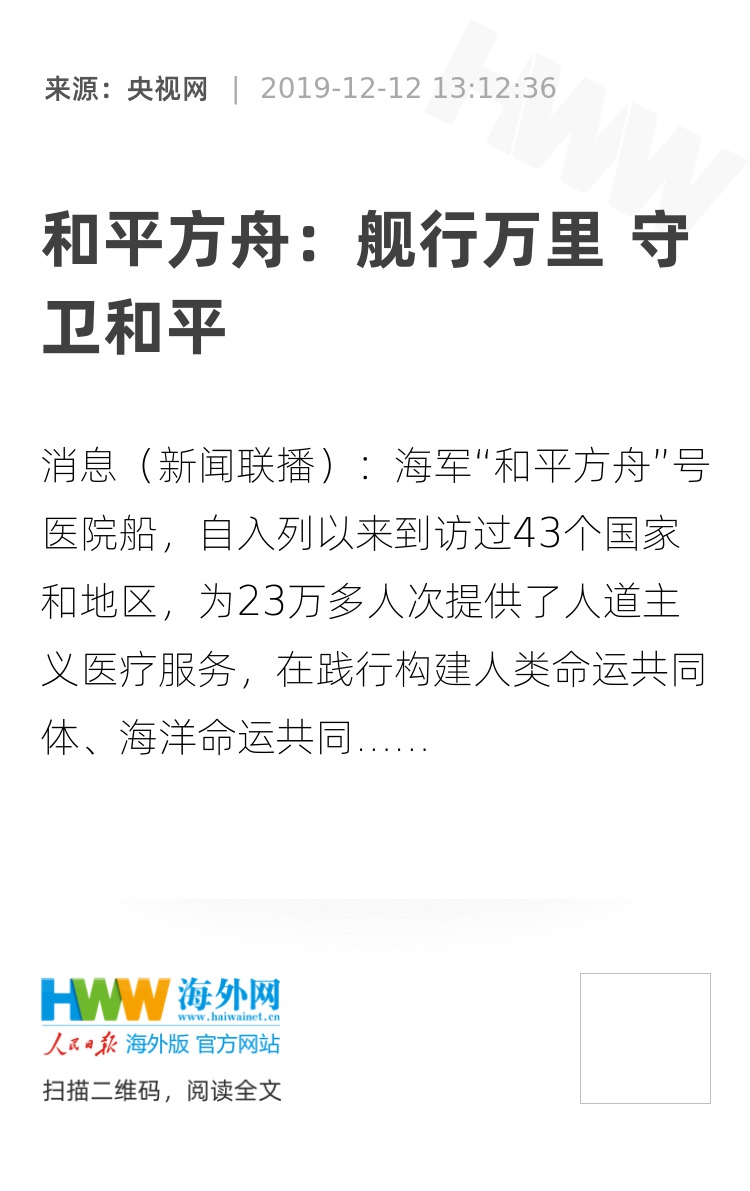 央视网消息(新闻联播):海军“和平方舟”号医院船,自入列以来到访过43个国家和地区,为23万多人次提供了人道主义医疗服务,在践行构建人类命运共同体、海洋命运共同体理念的航道上,向世界展示新时代中国负责任大国形象,成为新时代中国军事外交的“明星舰”。