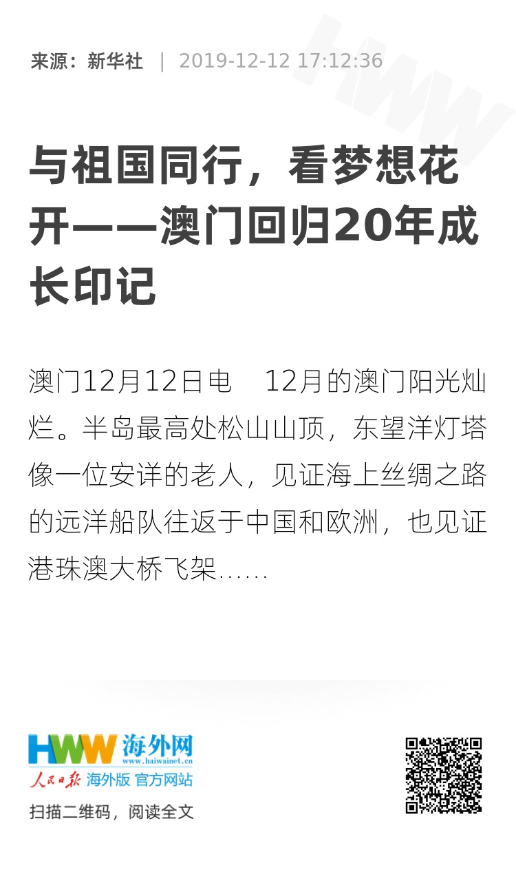 新华社澳门12月12日电 12月的澳门阳光灿烂。半岛最高处松山山顶,东望洋灯塔像一位安详的老人,见证海上丝绸之路的远洋船队往返于中国和欧洲,也见证港珠澳大桥飞架伶仃洋化碧波为通途,见证填海新区上公屋拔地而起……