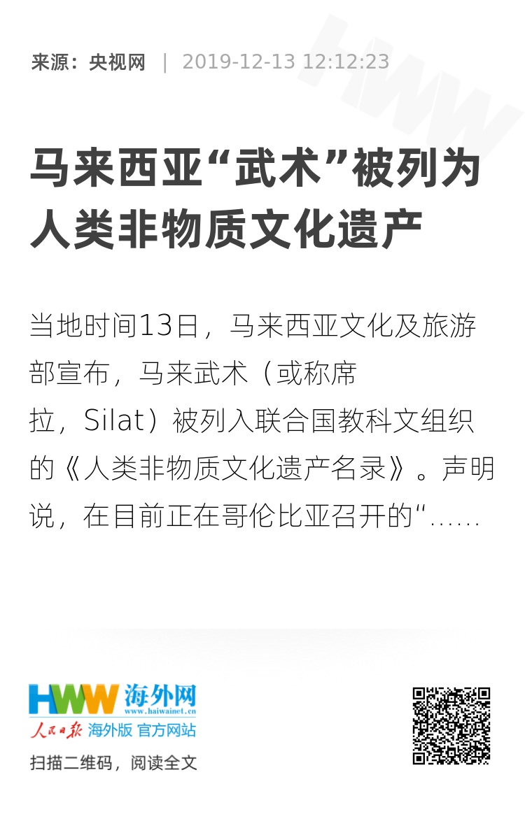 当地时间13日,马来西亚文化及旅游部宣布,马来武术(或称席拉,Silat)被列入联合国教科文组织的《人类非物质文化遗产名录》。