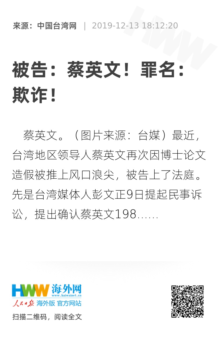 最近,台湾地区领导人蔡英文再次因博士论文造假被推上风口浪尖,被告上了法庭。