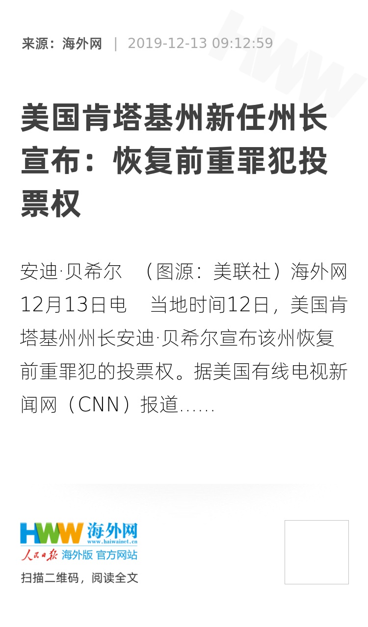 海外网12月13日电 当地时间12日,美国肯塔基州州长安迪·贝希尔宣布该州恢复前重罪犯的投票权。