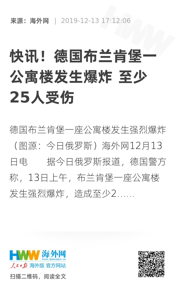 海外网12月13日电 据今日俄罗斯报道,德国警方称,13日上午,布兰肯堡一座公寓楼发生强烈爆炸,造成至少25人受伤,目前还不清楚爆炸的原因。