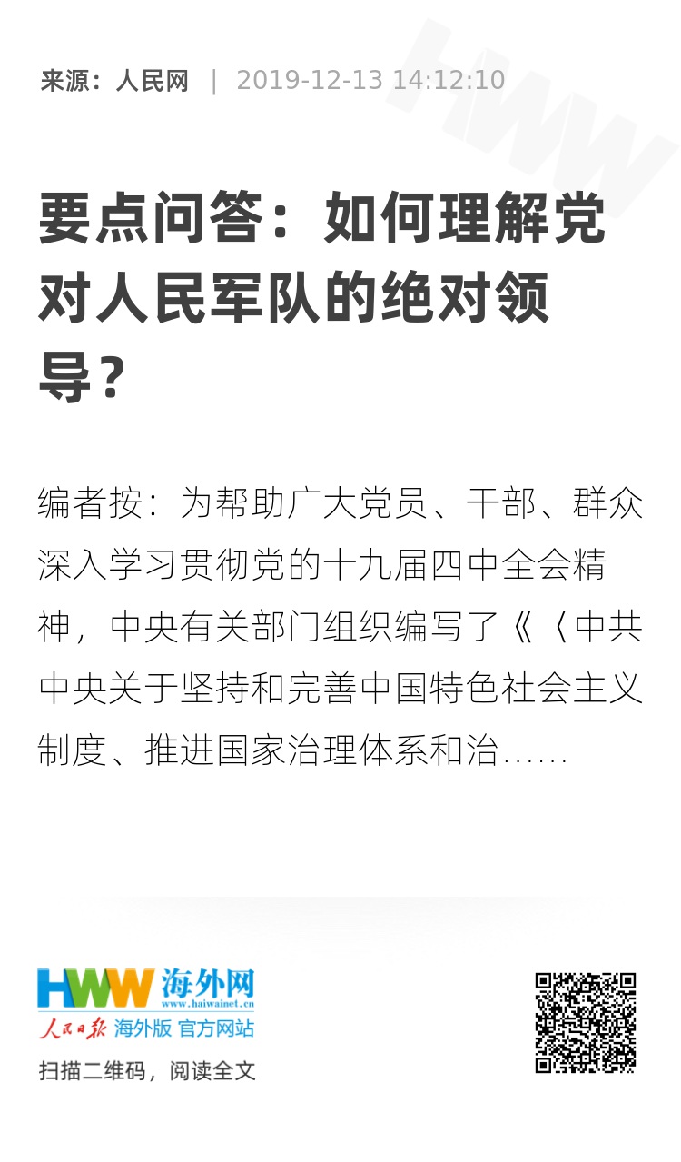 近日,人民日报刊发其中系列文章,人民网·中国共产党新闻网摘选其中内容,推出学习要点问答,以飨读者。今日推出“把党对人民军队的绝对领导贯彻到军队建设各领域全过程”要点问答。