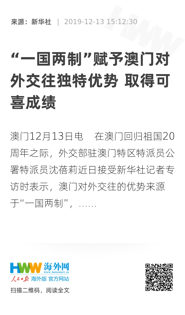 新华社澳门12月13日电 在澳门回归祖国20周年之际,外交部驻澳门特区特派员公署特派员沈蓓莉近日接受新华社记者专访时表示,澳门对外交往的优势来源于“一国两制”,在国家总体对外关系的引领和带动下,澳门对外交往取得可喜成绩,在提升澳门国际影响力的同时,配合了国家的多边外交。与此同时,外交部驻澳公署也围绕推动特区经济适度多元发展,积极落实外交惠澳方针,不断增强澳门民众的民族自豪感、自信心。