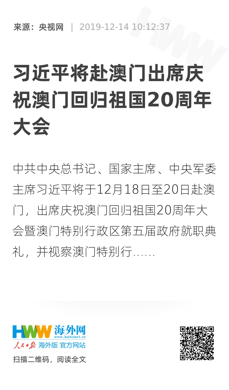 31682019,.习近平将赴澳门出席庆祝澳门回归祖国20周年大会,.2019-12-14 10:07:37,.204232,.朱箫