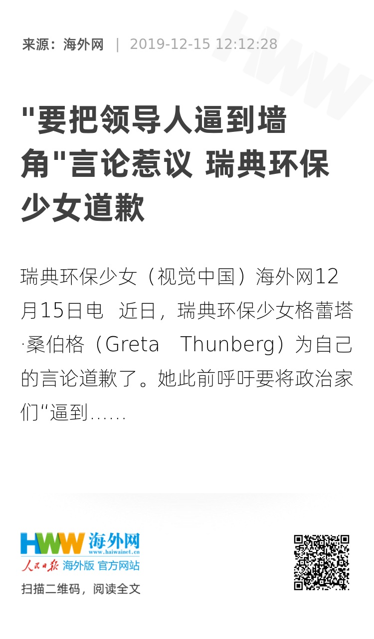 海外网12月15日电 近日,瑞典环保少女格蕾塔·桑伯格(Greta Thunberg)为自己的言论道歉了。她此前呼吁要将政治家们“逼到墙角”,被质疑在煽动暴力。她随后辩解称,这是在使用“瑞式英语”时产生的误会。